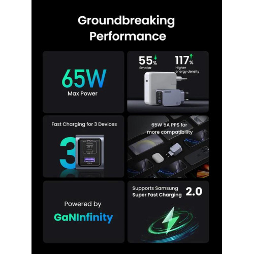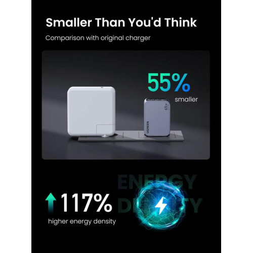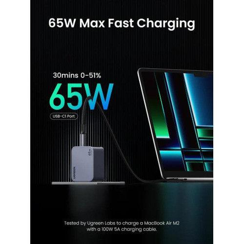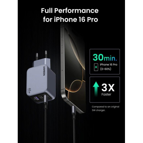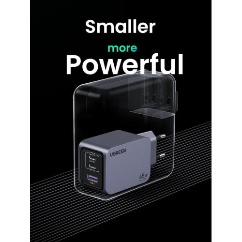 INCARCATOR retea Ugreen GaN Nexode "X755" Quick Charge 65W, 2 x USB Type-C, 1 x USB, include cablu USB Type-C la USB Type-C 1.5m, gri "25871" (timbru verde 0.18 lei)